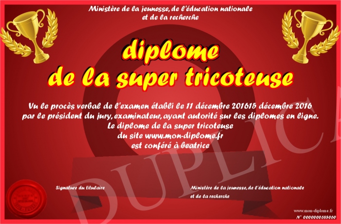 Envoyez par email votre diplome de la super tricoteuse personalisé