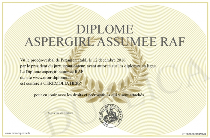 Envoyez par email votre Diplôme aspergirl assumée RAF personalisé