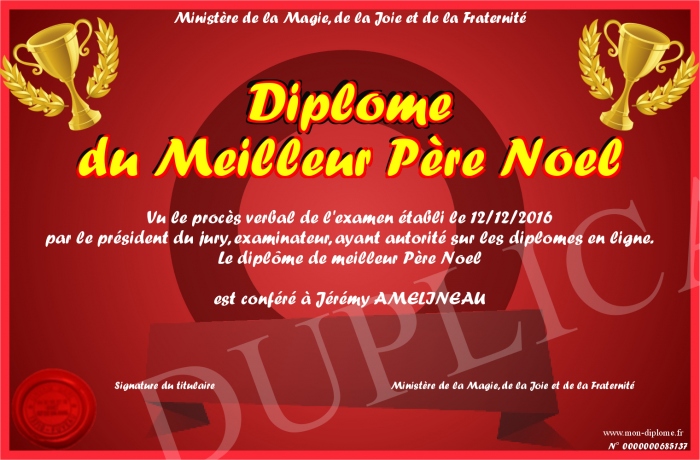 Envoyez par email votre Diplôme du Meilleur Père Noel personalisé