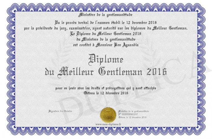 Envoyez par email votre Diplôme du Meilleur Gentleman 2016 personalisé