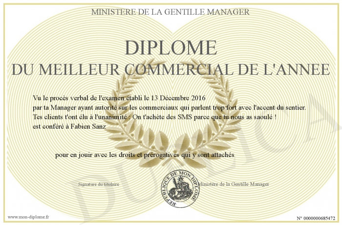 Envoyez par email votre Diplôme du meilleur commercial de l'année personalisé