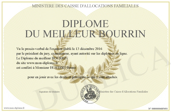 Envoyez par email votre Diplôme du meilleur BOURRIN personalisé