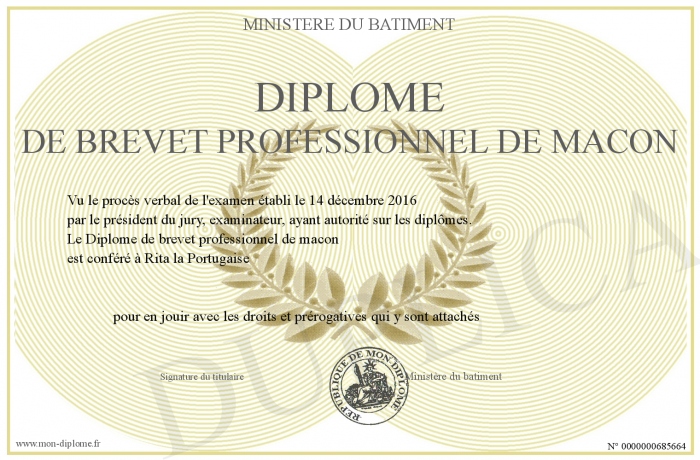Envoyez par email votre Diplome de brevet professionnel de macon personalisé