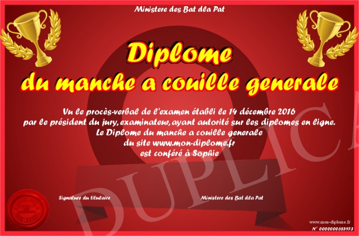 Envoyez par email votre Diplôme du manche a couille generale personalisé