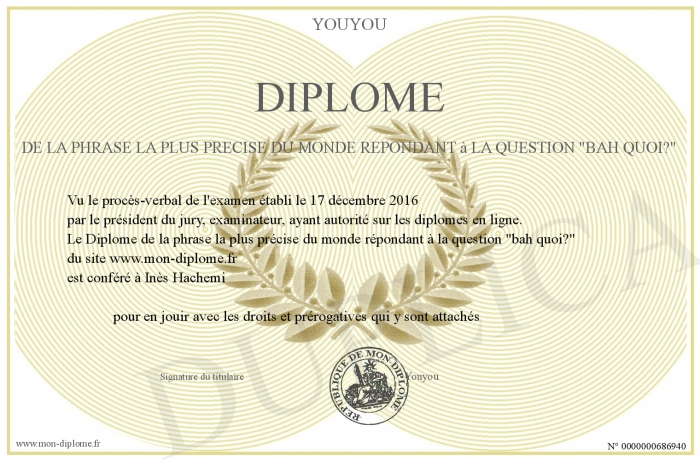 Envoyez par email votre Diplôme de la phrase la plus précise du monde répondant à la question -bah quoi?- personalisé