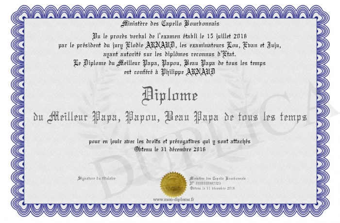 Envoyez par email votre Diplôme du Meilleur Papa, Papou, Beau Papa de tous les temps personalisé