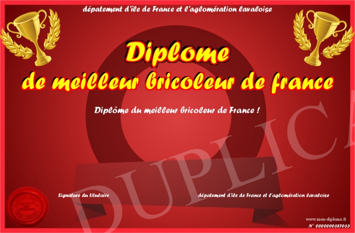 Envoyez par email votre Diplome de meilleur bricoleur de france personalisé