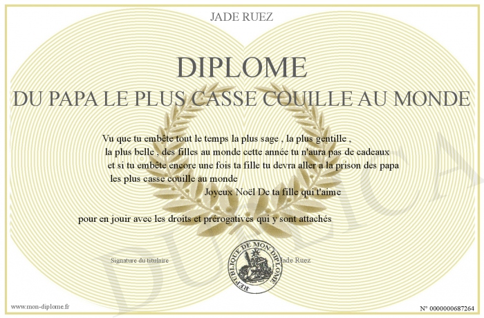Envoyez par email votre Diplome du papa le plus casse couille au monde personalisé