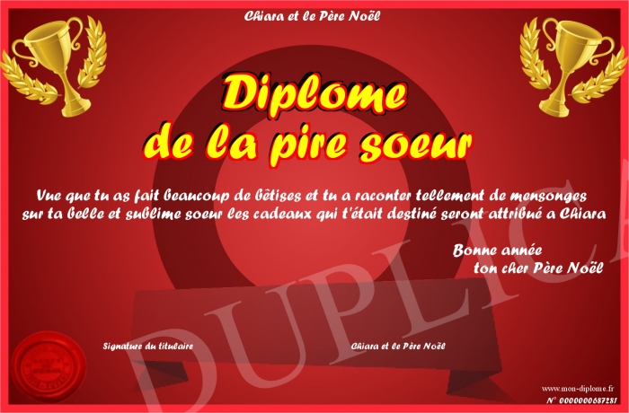 Envoyez par email votre Diplôme de la pire soeur personalisé