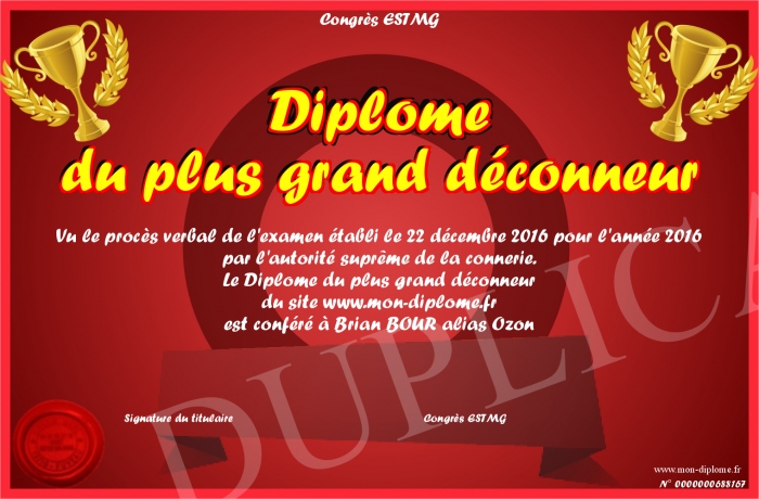 Envoyez par email votre Diplôme du plus grand déconneur personalisé