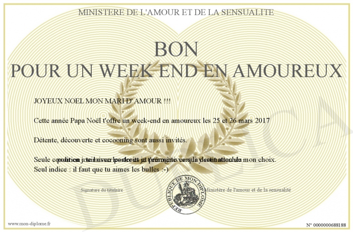 Envoyez par email votre BON POUR UN WEEK END EN AMOUREUX personalisé
