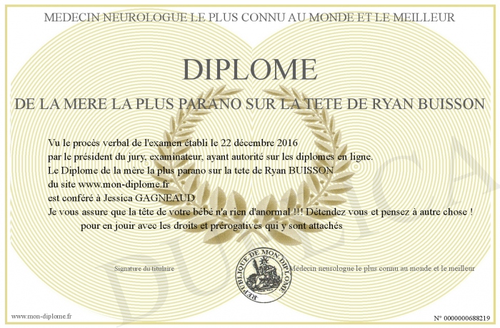 Envoyez par email votre Diplôme de la mère la plus parano sur la tete de Ryan BUISSON personalisé