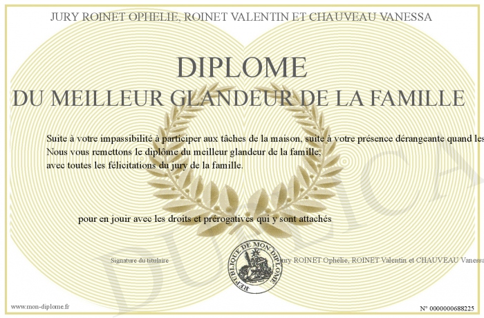 Envoyez par email votre Diplôme du meilleur glandeur de la famille personalisé