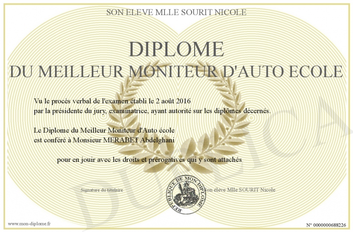 Envoyez par email votre Diplôme du Meilleur Moniteur d'Auto école personalisé