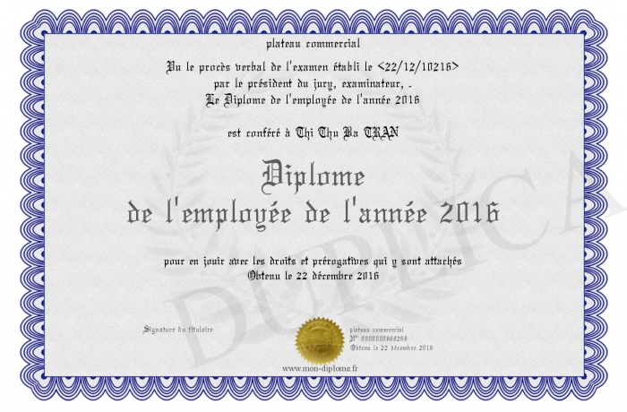 Envoyez par email votre Diplôme de l'employée de l'année 2016 personalisé