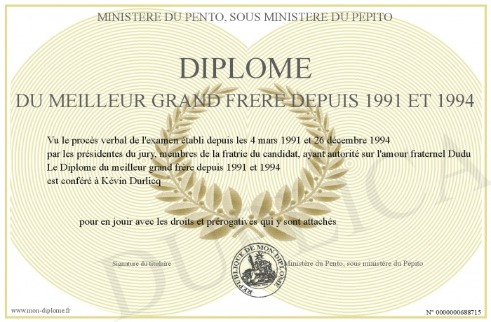 Envoyez par email votre Diplôme du meilleur grand frère depuis 1991 et 1994 personalisé