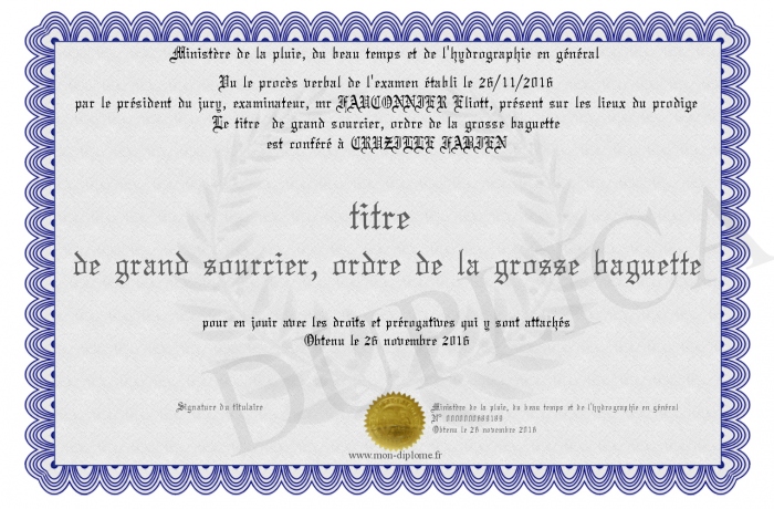 Envoyez par email votre titre de grand sourcier, ordre de la grosse baguette personalisé