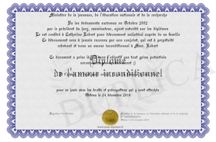 Envoyez par email votre Diplôme de l'amour inconditionnel personalisé