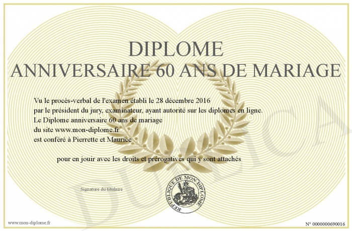 Envoyez par email votre Diplôme anniversaire 60 ans de mariage personalisé