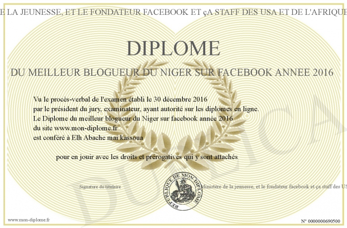 Envoyez par email votre Diplôme du meilleur blogueur du Niger sur facebook année 2016 personalisé