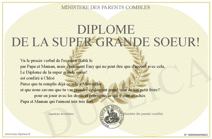 Envoyez par email votre Diplôme de la super grande soeur! personalisé