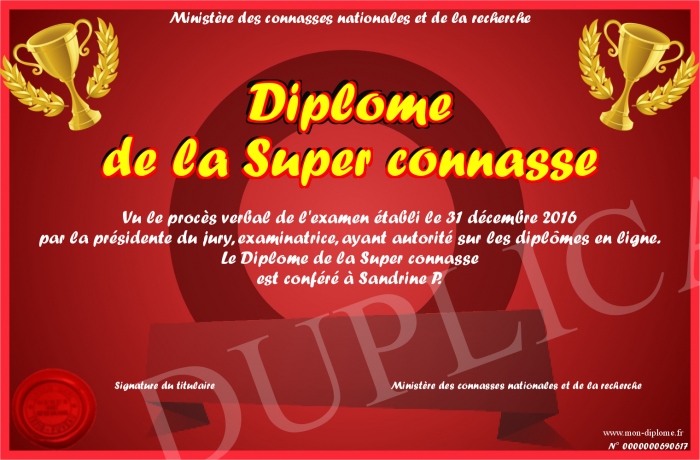 Envoyez par email votre Diplôme de la Super connasse personalisé