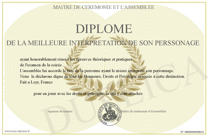 Envoyez par email votre Diplôme de la meilleure interprétation de son perssonage personalisé