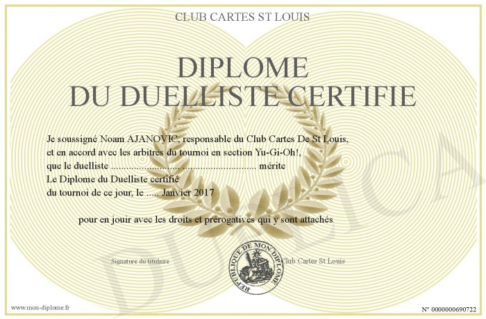 Envoyez par email votre Diplôme du Duelliste certifié personalisé