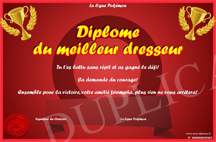 Envoyez par email votre Diplôme du meilleur dresseur personalisé