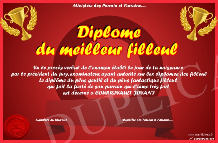 Envoyez par email votre Diplôme du meilleur filleul personalisé