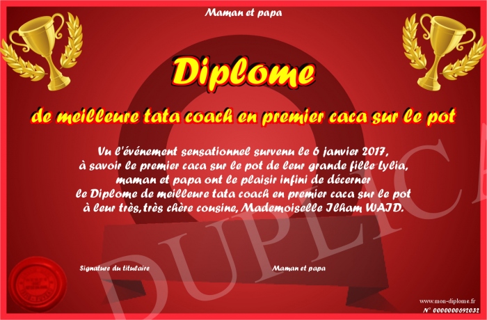 Envoyez par email votre Diplôme de meilleure tata coach en premier caca sur le pot personalisé