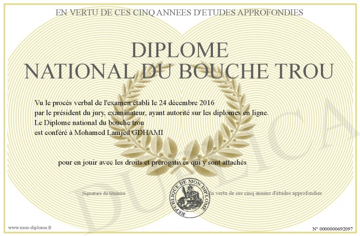 Envoyez par email votre Diplôme national du bouche trou personalisé