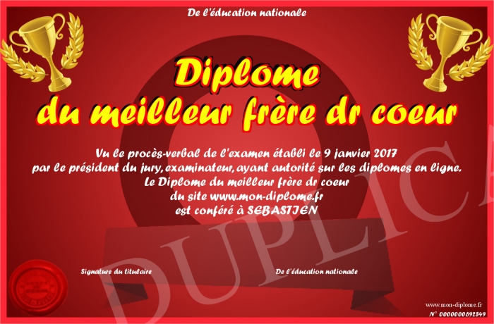 Envoyez par email votre Diplôme du meilleur frère dr coeur personalisé