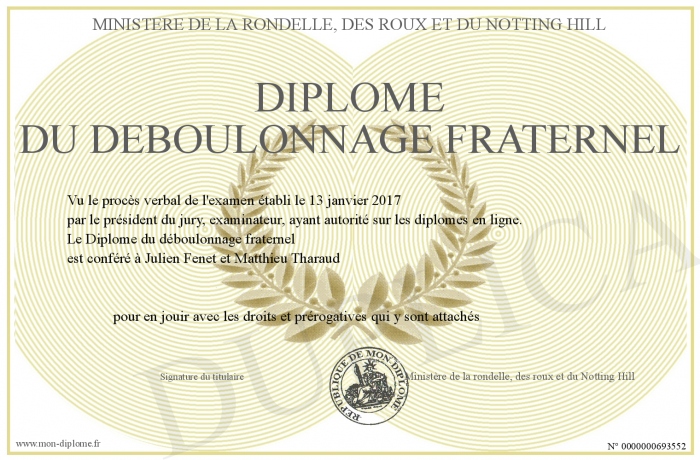 Envoyez par email votre Diplome du déboulonnage fraternel personalisé
