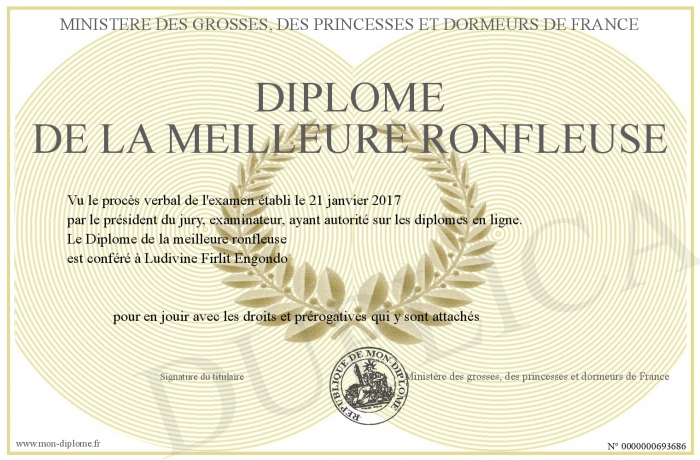 Envoyez par email votre Diplôme de la meilleure ronfleuse personalisé