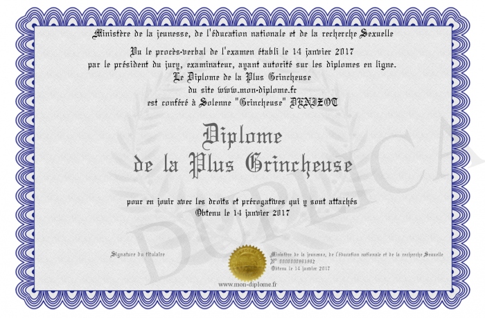 Envoyez par email votre Diplôme de la Plus Grincheuse personalisé
