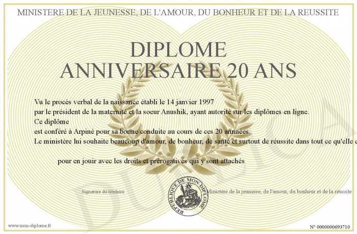 Envoyez par email votre Diplôme anniversaire 20 ans personalisé