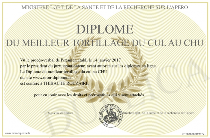 Envoyez par email votre Diplôme du meilleur tortillage du cul au CHU personalisé