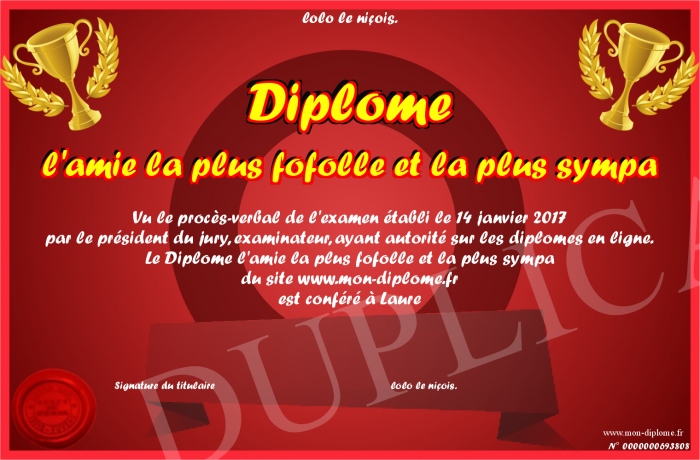 Envoyez par email votre Diplôme l'amie la plus fofolle et la plus sympa personalisé
