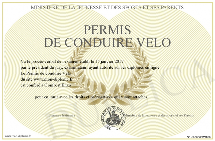 Envoyez par email votre Permis de conduire Vélo personalisé