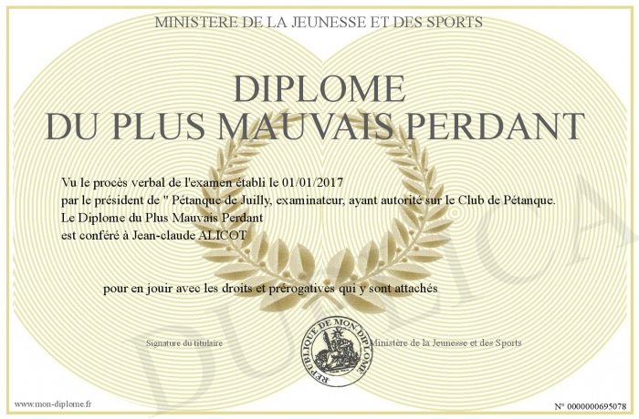 Envoyez par email votre Diplôme du Plus Mauvais Perdant personalisé