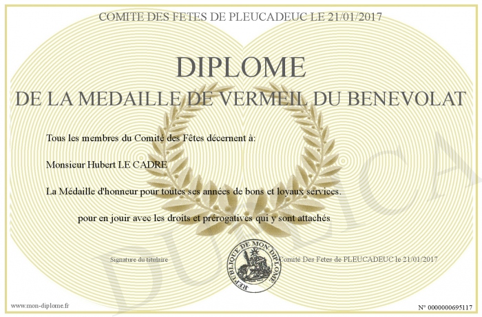 Envoyez par email votre Diplome de la médaille de vermeil du benevolat personalisé