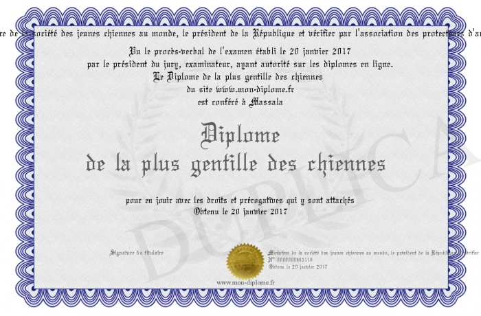 Envoyez par email votre Diplôme de la plus gentille des chiennes personalisé
