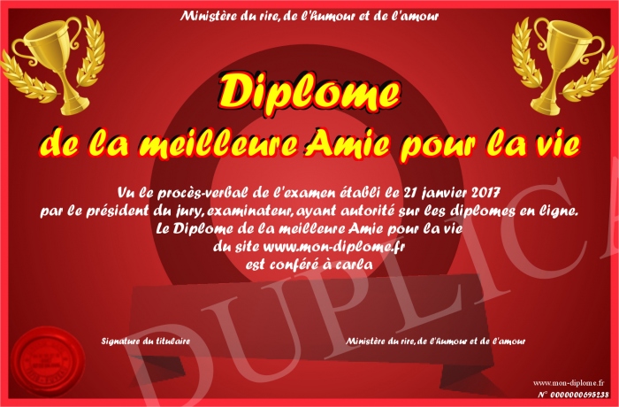 Envoyez par email votre Diplome de la meilleure Amie pour la vie personalisé