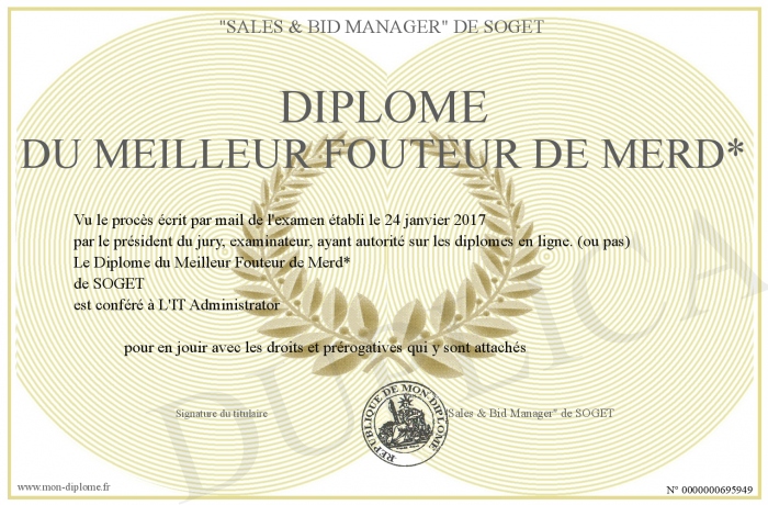 Envoyez par email votre Diplôme du Meilleur Fouteur de Merd* personalisé