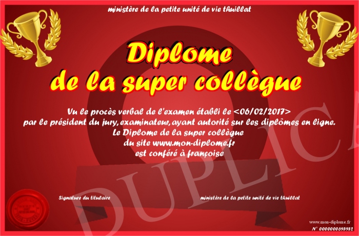 Envoyez par email votre Diplôme de la super collègue personalisé