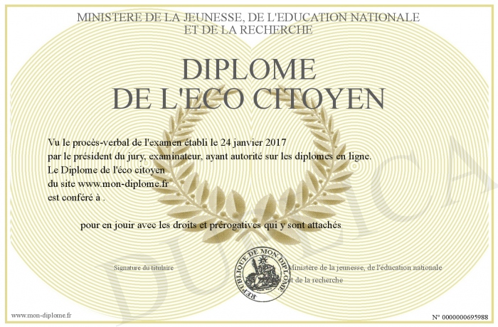 Envoyez par email votre Diplôme de l'éco citoyen personalisé