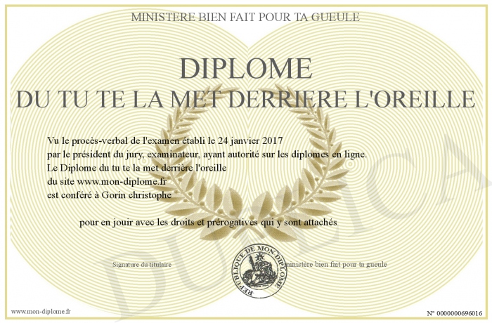 Envoyez par email votre Diplôme du tu te la met derrière l'oreille personalisé