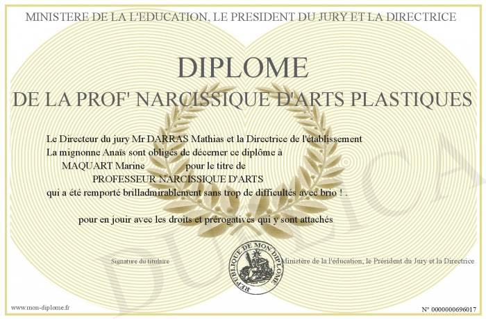 Envoyez par email votre Diplôme de la Prof' narcissique d'arts plastiques personalisé