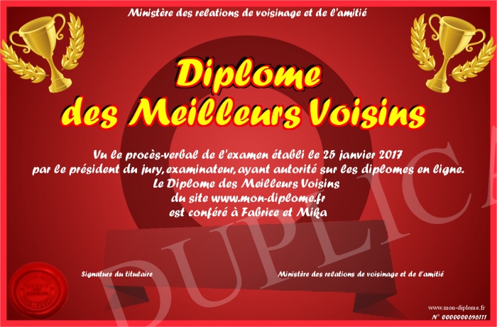 Envoyez par email votre Diplôme des Meilleurs Voisins personalisé
